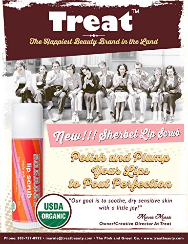 -. Binding : Health and Beauty -. Brand : Treat -. EAN : 0851656003484 -. Feature : Healthy lips are happy lips, you're going to love this lip scrub in a stick, it's the perfect treat to exfoliate your dry, chapped lips / What is a lip scrub? A lip scrub is used to exfoliate and smooth dry, chapped and flaky lips, after scrubbing follow with a treat lip balm / Extra gentle for the delicate skin on the lips: gently exfoliates chapped lips with organic coconut oil and sugar / Made with pure organic coconut oil: coconut oil is the ultimate natural moisturizer and so good for chapped lips / 100 percent happiness guarantee: we'll make it right if you're not happy / No one wants to kiss someone with dry flaky lips. Smooth plump lips are a sign of youth and starts with a good scrub. / Don't use a lip scrub with a warning label on it. Use one with only pure USDA certified organic ingredients that are good for you and your kids. / We never ever test our products on animals, our furry friends are for hugs not tests. -. Label : Treat -. Manufacturer : Treat -. MPN : SLS -. NumberOfItems : 1 -. PackageQuantity : 1 -. PartNumber : SLS -. ProductGroup : Beauty -. ProductTypeName : BEAUTY -. PublicationDate : 2015-09-10 -. Publisher : Treat -. ReleaseDate : 2014-10-31 -. Size : 0.500 Ounce -. Studio : Treat -. Title : Treat Organic Sherbet Lip Scrub in a Tube USDA Certified Organic Cruelty Free .50 Ounce -. UPC : 851656003484