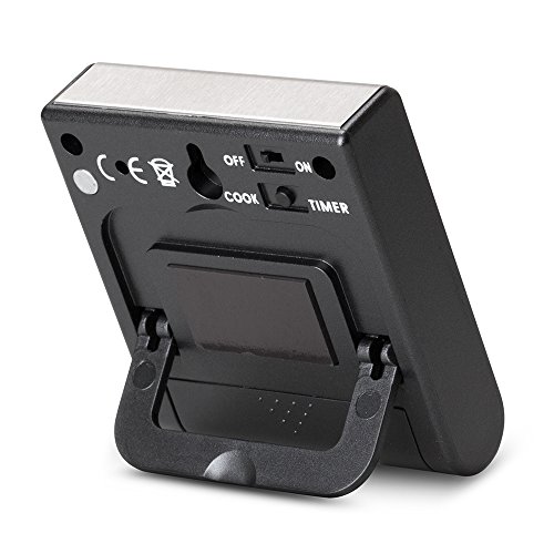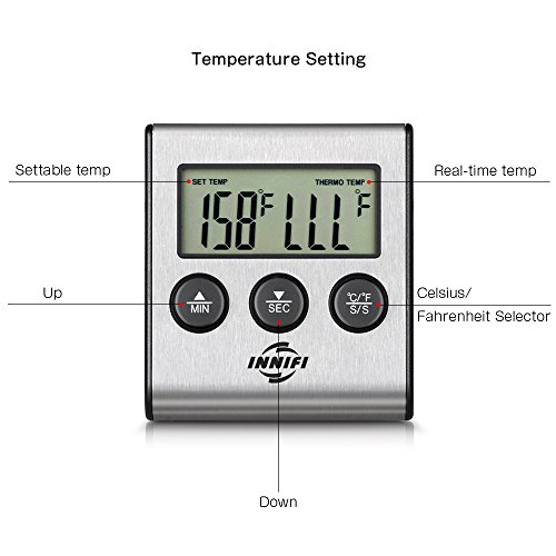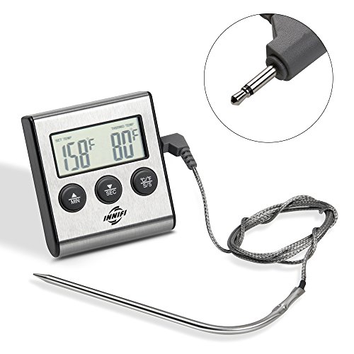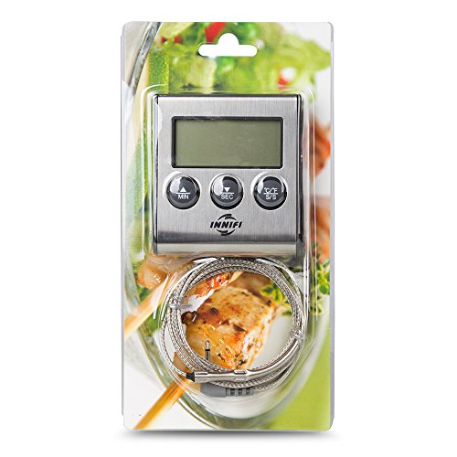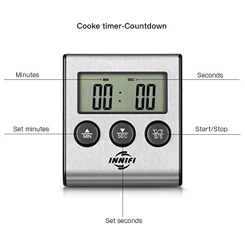 Studio : Innifi Publisher : Innifi Binding : Kitchen Product Description Tips: 1. Turn on the thermometer, you can change Fahrenheit and Celsius as you like in pressing the "℃/℉/s/s". 2. The off/on button can help you save electricity. 3. Press the button "cook timer", the min button and the sec button can only increase the set temp. If you set a wrong time, you have to press the min and the sec at the same time to reset the countdown. Since you have set the wanted time, press the s/s button to star or stop the timer. 4. The thermo temp will be "lll" if you do not insert the plug. It will not show the real-time temperature. Attention: 1. Probe and wire can withstand up to 572℉(300℃). It will be dangerous if the testable temperature is more than the maximum of 300℃ and the sensor will be damaged easily. 2. Although we have added a waterproof ring in the bottom of the probe, it is not absolutely waterproof. Water will flow into the gap of the joint between the ring and the cable. It means you can't soak the whole probe in the water, otherwise, the sensor will not work gradually. 3. The suggested way to clean is to wipe the dirt. Washing perhaps leads to damage to the sensor. Features: Clear lcd display to easily determine meat temperature and current settings program your own temperature settings manually countdown timer and alarm step-down probe tip design Celsius/Fahrenheit selector reducible holder. Specifications battery: 1 x aaa battery? resolution: 1 degree. Temperature range: -58℉ to 572℉ (-50℃ to 300℃)? temperature accuracy: ±1.8℉ (±1℃) from 32 to 212℉ (0 to 100℃) probe length: 4.3" food grade stainless steel probe cable length: 40" stainless steel mesh cable lcd display size: 1.85h×0.23w inches (47 h×21 w mm) dimensions: 2.80 h×2.56 w×0.69 d inches (71 h×65w×17.5 d mm) uses: Bbq, oven, smoker, candy, meat, steak, liquid. With high accuracy: 1℃ resolution, ±1.8°f/1℃ accuracy for the best possible cook. 0