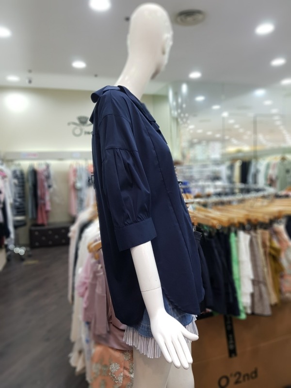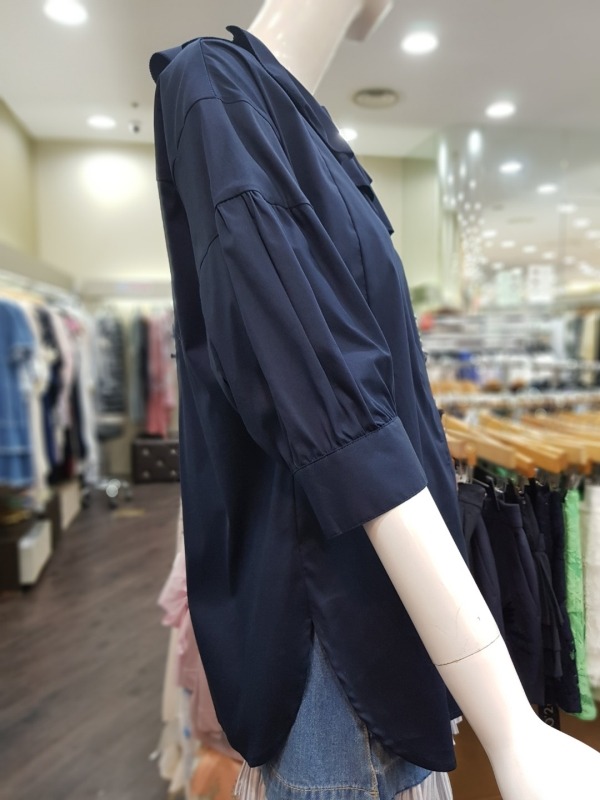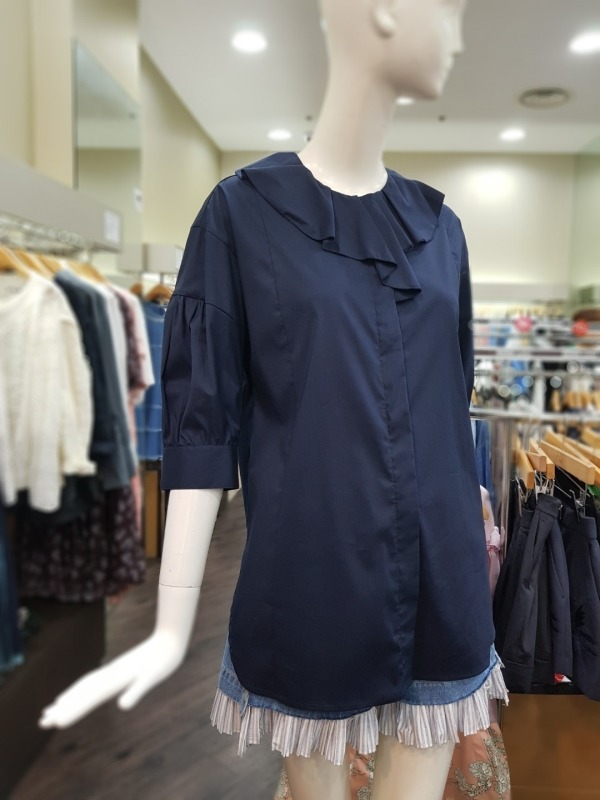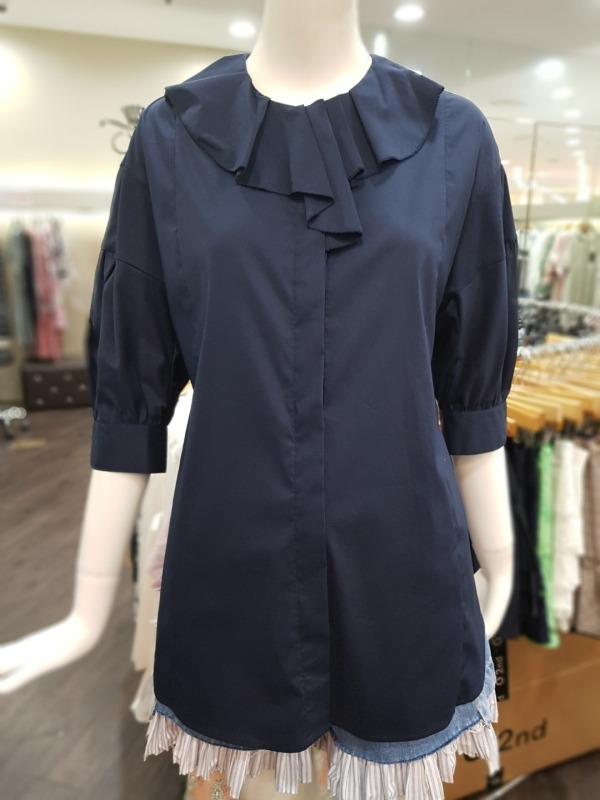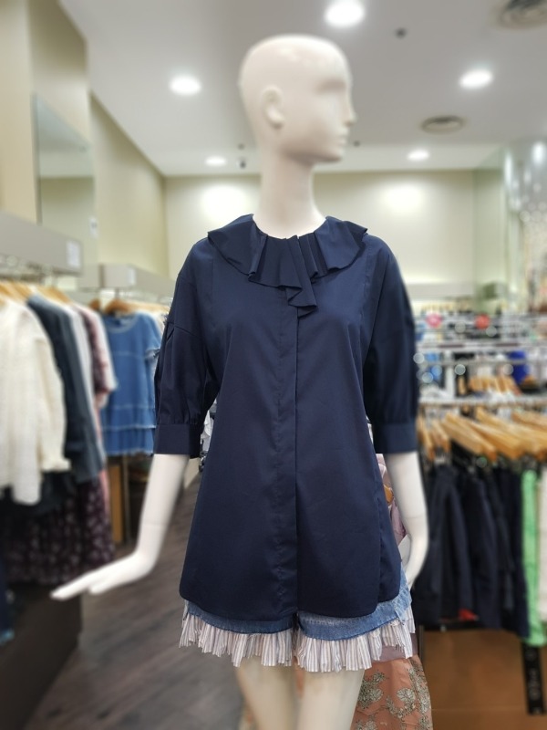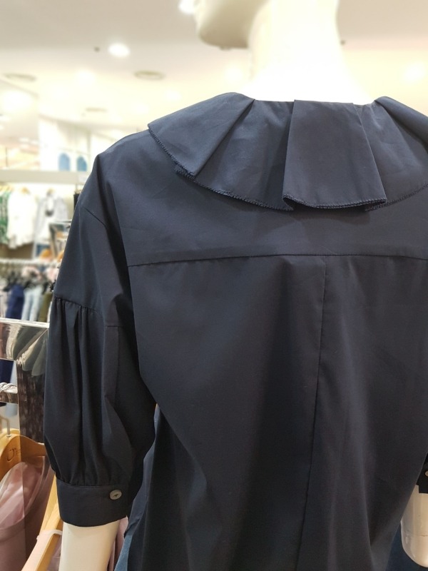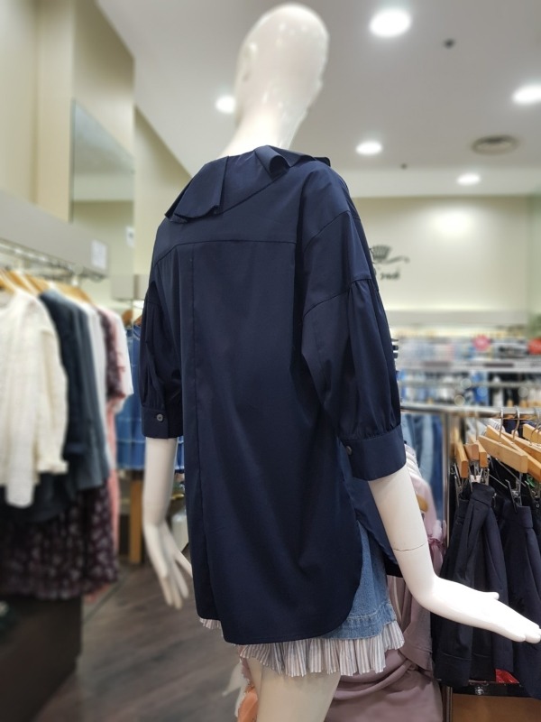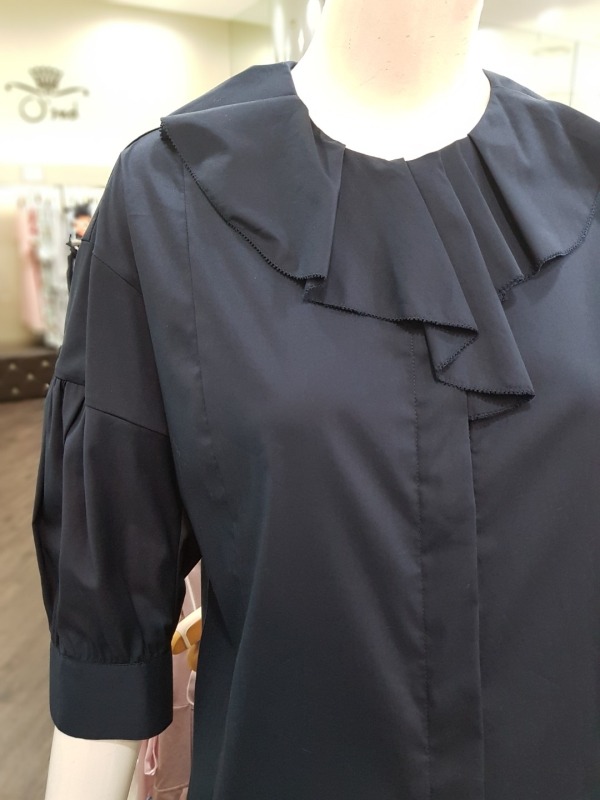 넥라인에 큰 프릴이 포인트로 들어간 블라우스로 팔부분에도 벌룬같은 디테일이 들어가 있습니다.