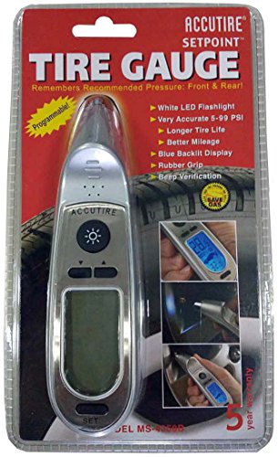 Easy-to-use, multi-featured gauge with an extra large, blue, backlit LCD screen and ergonomic styling. It measures PSI from 5-99 pounds in 0.5-pound units, and includes the patent-protected Set Point programmable feature which allows for recording the factory-recommended tire pressure for both front and rear tires. Other helpful features include a white LED flashlight to make checking tire pressure at night or in the garage a cinch; an audible pressure signal; auto off; and a five-year manufacturer warranty.Feature