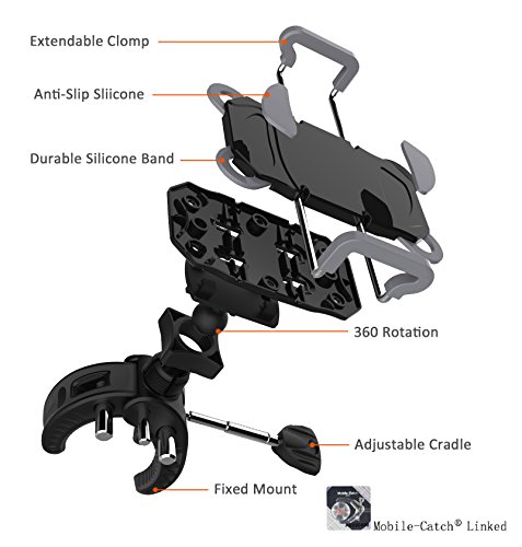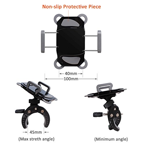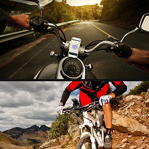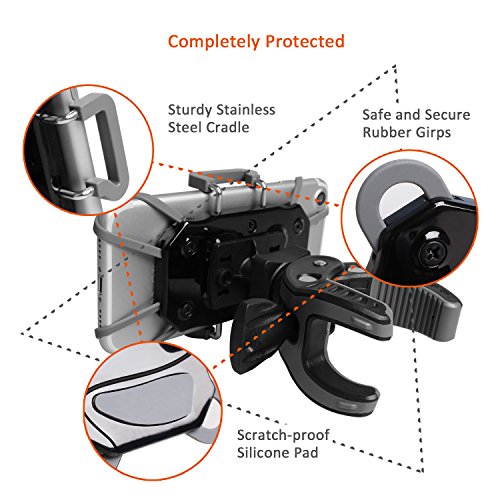 SHOCKPROOF DESIGN: 360 degree rotatable holder lets you change perspective with a simple spin and extends up to 3.7 inch to hold devices of various sizes. Anti-slide silicone lining on the clamp securely anchors all four corners of your phone, firmly holds your Phone / GPS Device on your motorcycle, bike mount and cradle, which guard against falls, slides, and scratches