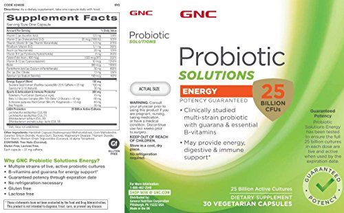 25 Billion Cfus Clinically Studied Multi-Strain Probiotic With Guarana & Essential B-Vitamins May Provide Energy, Digestive & Immune Support Why Gnc Probiotic Solutions Energy? Multiple Strains Of Live, Active Probiotic Cultures B-Vitamins And Guarana For Energy Support Guaranteed Potency Through Expiration Date No Refrigeration Necessary Gluten Free Lactose FreeFeature