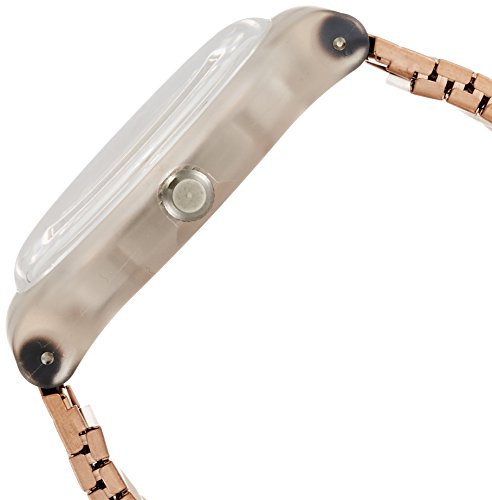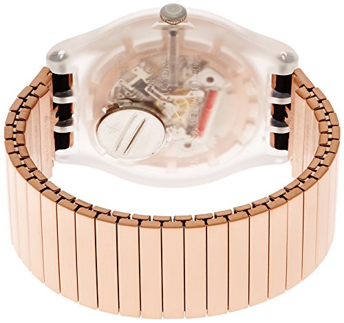 Translucent plastic case with a pink-tone stainless steel bracelet. Fixed translucent plastic bezel. Pink dial with index hour markers. Arabic numerals mark the 3, 6, 9 and 12 o'clock positions. minute markers around the outer rim. Day of the week and date display at the 3 o'clock position. Quartz movement. Pull / push crown. Translucent case back. Case diameter: 41 mm. Case thickness: 9.85 mm. Round case shape. Tang clasp. Water resistant at 30 meters / 100 feet. Casual watch style. Swatch Rostfrei Watch SUOK707B.