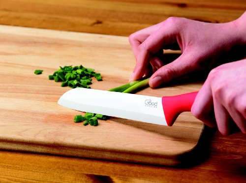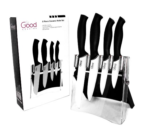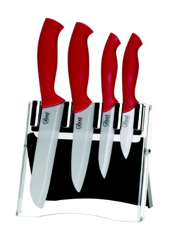 Ceramic Knife Set with Block- 5 Piece Cutlery Set by Good Cooking (Red Handles)- Our ceramic knives are the better alternative to stainless steel. Featuring soft touch handles, these knives are perfectly balanced and a pleasure to use. Unlike stainless steel, these won't rust or corrode. The ultra sharp blade can go months or years without sharpening and is dishwasher safe. Includes paring, fruit, chef's, and santoku knives along with stylish acrylic block.