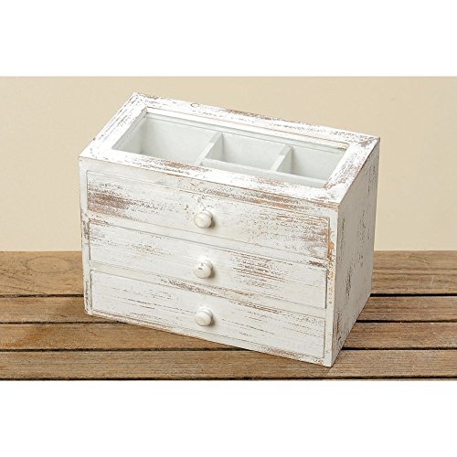 - Made by Hand: Designed like a small piece of furniture, this beautiful white washed wood box has 3 drawers, with the first full of compartments and 2 lower drawers ready to stow away your trinkets and treasures. Given their handmade and hand-finished nature of this box, slight variations in appearance are to be expected and celebrated. Each one is unique and no two are exactly alike