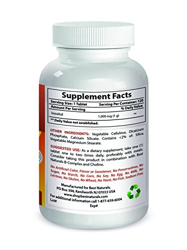 -. Binding : Health and Beauty -. Brand : Best Naturals -. EAN : 0817716014302 -. Feature : Cellular Detoxification* / Healthy Membrane Function* / Supports Liver Function* / Supports healthy hair & enhances mood / All Best Naturals products are manufactured in accordance with Good Manufacturing Practices (GMP), among the highest standards in the world -- Proudly Made in USA -- Purity & Potency Guaranteed -. IsAdultProduct : 0 -. Label : Best Naturals -. Manufacturer : Best Naturals -. ProductGroup : Health and Beauty -. ProductTypeName : HEALTH_PERSONAL_CARE -. Publisher : Best Naturals -. Studio : Best Naturals -. Title : Best Naturals Inositol 1000 mg 120 Tablets -. UPC : 817716014302
