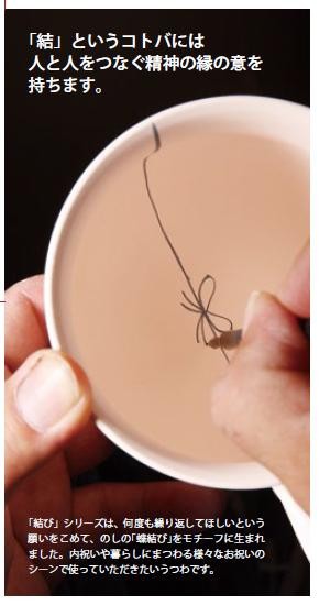 | 縁を結ぶ、つながる、絆、「結び」に込められたメッセージです。「結び」シリーズは、何度も繰り返してほしいという願いをこめて、のしの「蝶結び」をモチーフに生まれました。内祝いや暮らしにまつわる様々なお祝いのシーンで使っていただきたいうつわです。 |