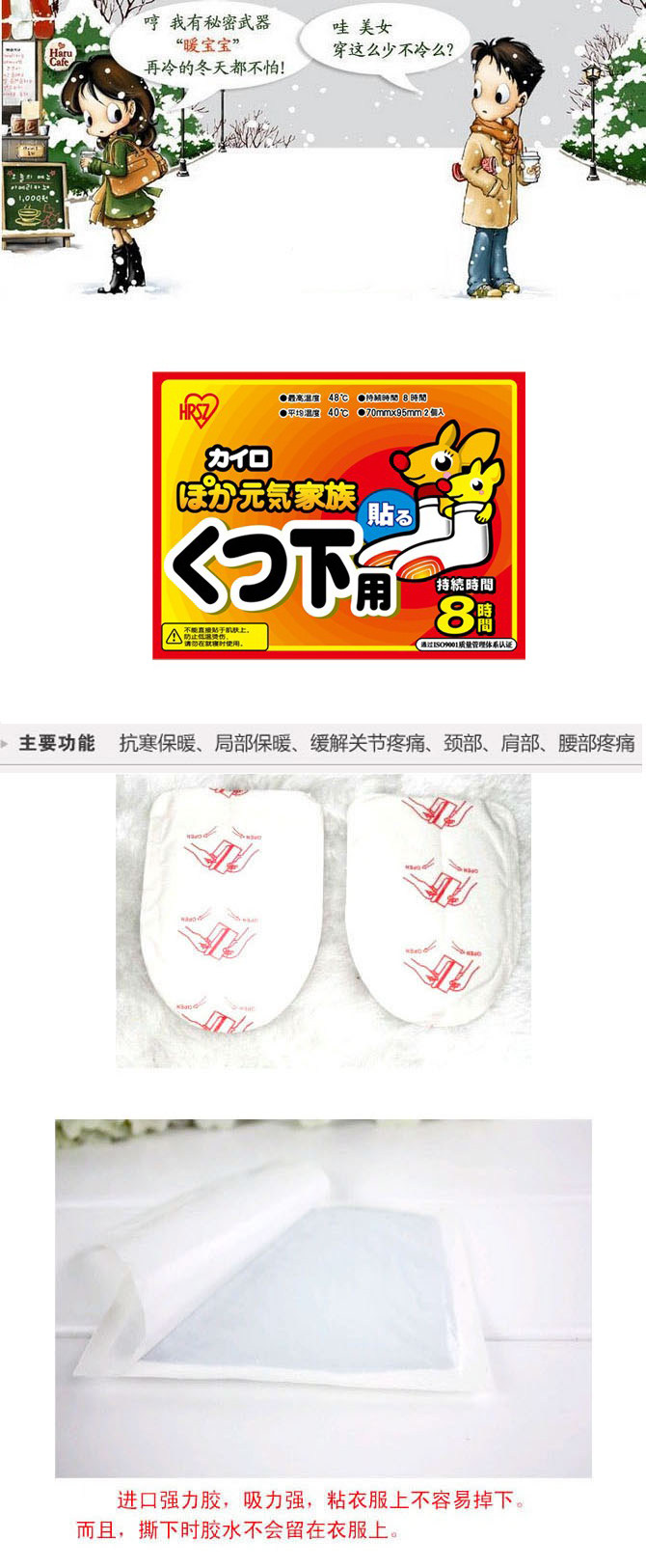 Warm foot paste convenient, ultra-thin design, the front sole part attached to thebottom of socks, walking, cycling are not affected by any. With safety, effectiveness and sustainability.