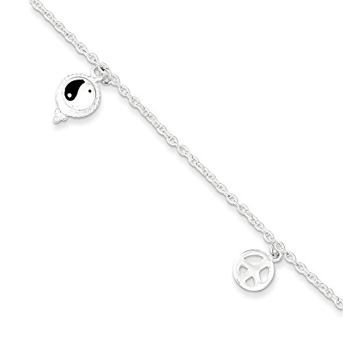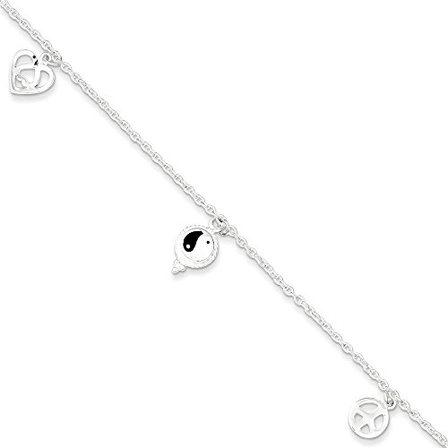 -. Title : Genuine 925 Sterling Silver Polished Hearts, Yin Yang & Peace Sign Anklet Length 9 Inch