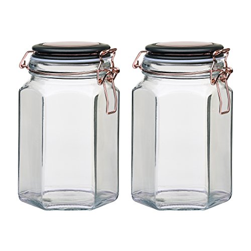 Amici Home, 7CN138S2R, Adler Collection Hermetic Preserving Glass Canister, Hexagonal Faceted Body, Black and Copper Lid, Food Safe, 32 Ounces (Medium) Set of 2