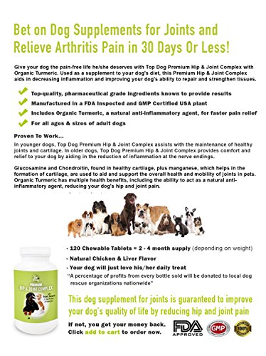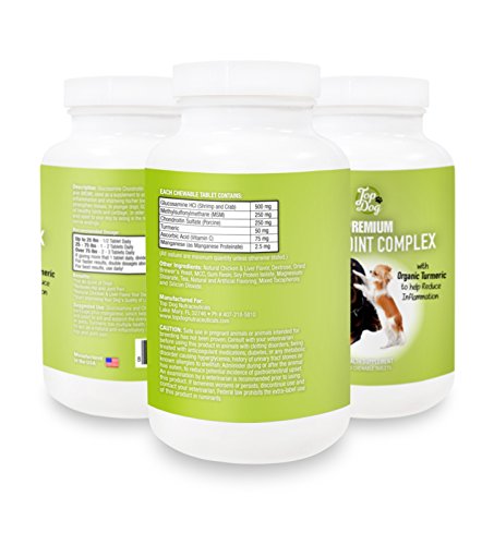 -. Feature : • DOG SUPPLEMENTS FOR JOINTS - Help your beloved dog get rid of joint pain once and for all with this premium, high quality supplement that creates an optimal environment for your dog's body to start healing itself! / • FREEDOM OF MOVEMENT - This dog supplement for joints gets your dog moving freely again by putting his or her joints awash in a sea of protective fluid that reduces friction between cartilage and other tissue and protects the joint's flexibility! / • HIGH QUALITY INGREDIENTS - Contains Glucosamine and Chondroitin, which are found in healthy cartilage, plus manganese, which helps in the formation of cartilage, to aid and support the overall health and mobility of joints in pets! This dog supplement for joints also contains Turmeric, which has multiple health benefits, including the ability to act as a natural anti-inflammatory agent, reducing your dog's hip and joint pain. / • WORKS FOR YOUNGER & OLDER DOGS - In younger dogs, Top Dog Premium Hip & Joint Complex assists with the maintenance of healthy joints and cartilage. In older dogs, this dog supplement for joints provides comfort and relief to your dog by aiding in the reduction of inflammation at the nerve endings. / • MONEY-BACK GUARANTEE - Ready to help your dog decrease inflammation and repair and strengthen tissue? Just click add to cart to order your supply of Top Dog Premium Hip & Joint Complex. This product works for dogs of all sizes and ages and it is manufactured in a FDA Inspected and GMP Certified USA plant. So don't delay, order now ... your purchase will be backed by a money-back guarantee.