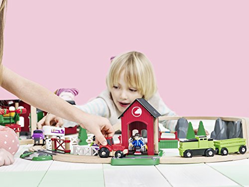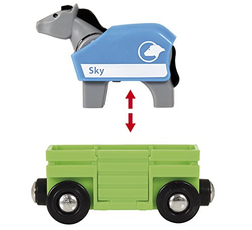 -. Feature : A countryside horse theme wooden railway set. Fully compatible with all other BRIO railway sets / Includes battery operated train (batteries included) with start-stop function / Horse wagon comes complete with fold-out ramp / For ages 3+ / Layout Size: 25.75" x 28.25"