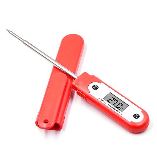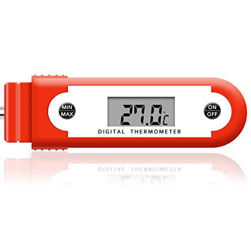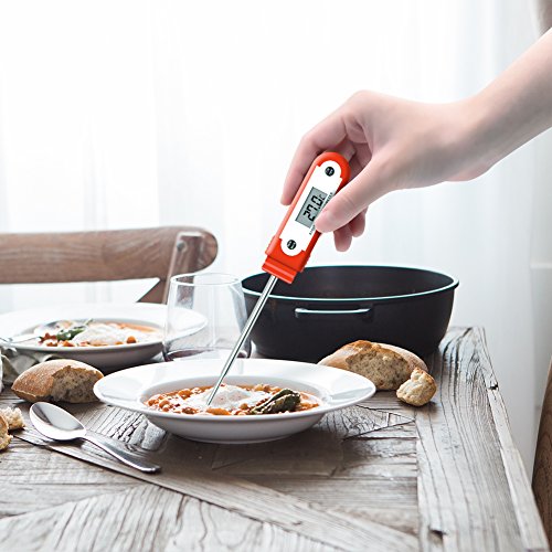 - FOLDABLE PROBE DESIGN ¨C The long stainless steel is flexible and foldable, can stored in your pocket, apron and cabinet. Scientific design with strong magnet on the back and hand hole is convenient to hook it either on your refrigerator or on wall. No more hasty to find your thermometer.