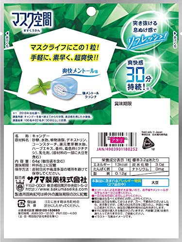 原材料:砂糖、水飴、植物油脂、デキストリン、コーンスターチ、還元麦芽糖水飴、ハーブエキス、香料、着色料(クチナシ)、乳化剤、(原材料の一部に大豆を含む)
