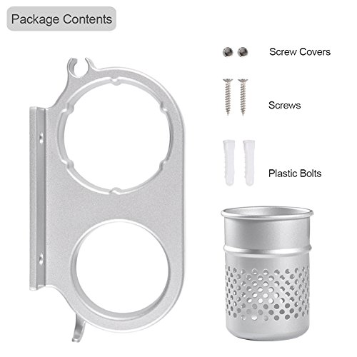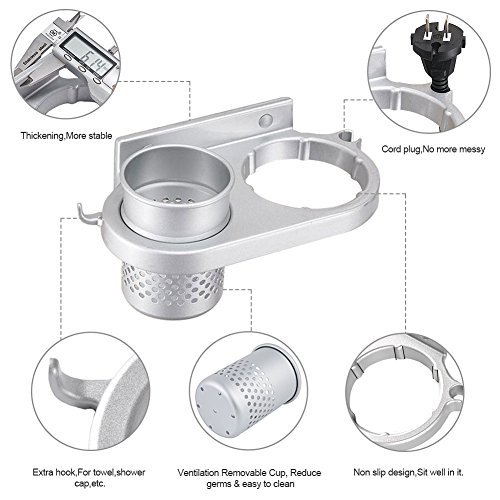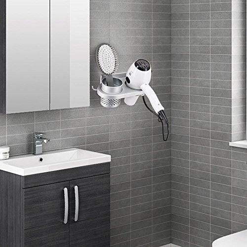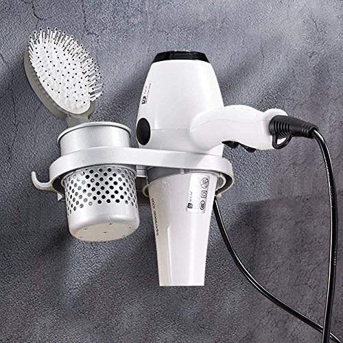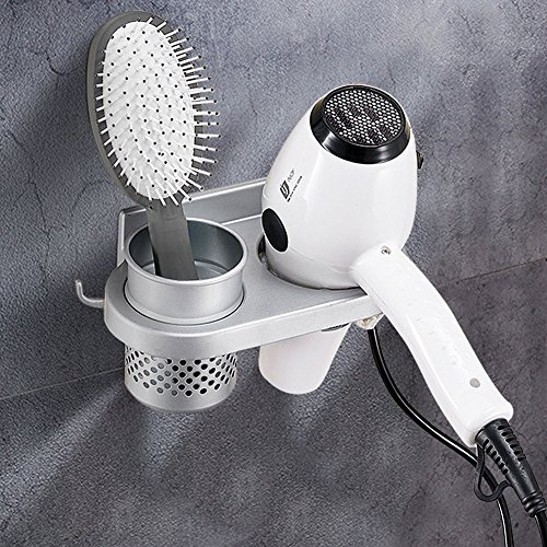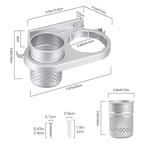 - Compact Size & Multifunctional: Total size (L) x (W)x (H) 20 x 11 x 10 cm / 7.87"x 4.33"x 3.93".Weight:0.56lb.Takes little space on your wall while keep your hair dryer and other stuff neatly organized and easily accessible.The removable cup can hold mini flat iron, hair straightener,curling iron,brush,comb,toothpaste,toothbrush,lipstick, razor etc.Its hollowed out design allows ventilation and reduces germs.Extra hook can hang a towel, brush, shower cap or watch etc.
