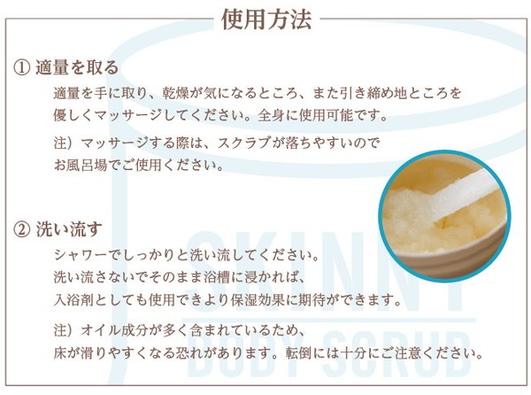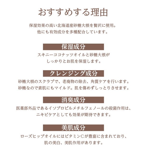 | 全身洗浄、保湿、引き締めケアが、これ一つで出来ちゃう! ボディークレンジングとボディーマッサージを、もっと手軽に楽しもう!! ●老廃物除去、角質ケア、高保湿などの機能成分を配合したボディースクラブです。 ●使用しているシュガー(砂糖大根)は、体を温めながら古い角質を除去し、肌の上で徐々に溶け、そのまま肌を保湿していきます。 ●シュガーを使用することで、肌への刺激が少ないボディーケア商品として、どなたにも安心してご使用いただけます。 ●配合のイソプロピルメチルフェノール、オリジナル香料で気になる体臭を抑え、美容成分が洗い上がりの保湿感、ボディーの引き締め感が期待できます。 ●気になるボディーケアの実感、ぜひ体験してみてください!! |