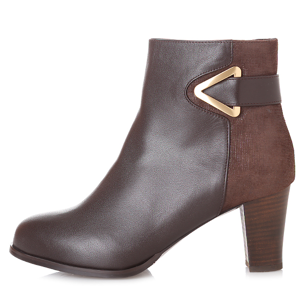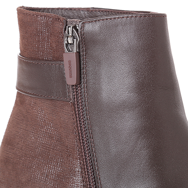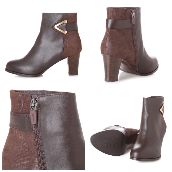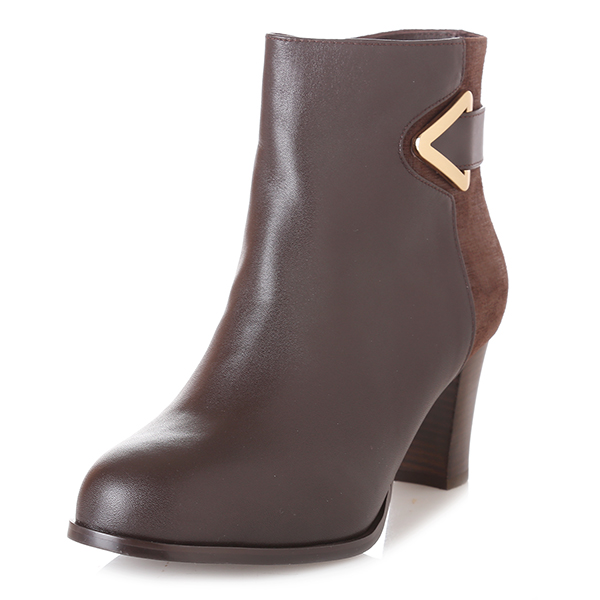 삼각형의 금속장식과 뒤쪽의 텍스쳐가 다른 가죽을 콤비로 디테일을 더한 앵클부츠. 기본형 스타일로 데일리한 아이템으로 활용도가 높음.
