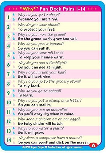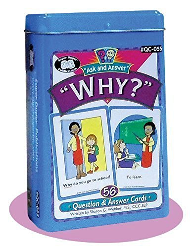 Teachers and parents send us more thank you letters about this innovative "Ask and Answer" card series than any other product we've ever developed. Why? The art is child-friendly; the "Who?, What?, When?, Where?, Why?" questions are easy to understand; and kids of all ages love to play card games...That's a winning combination!Ask and Answer "Why?" Cards feature: - 56 illustrated cards (2 ½" x 3 ½") - 28 "Why?" Question/Answer card pairs - Game ideas and content cards - Packaged in a sturdy storage tin Ask and Answer "WH" Cards may be purchased on Amazon as a 5-deck combo or as individual card decks (Who?, What?, When?, Where? Why?).