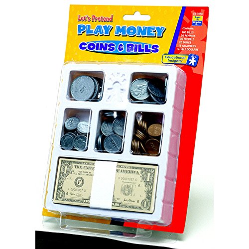 The most realistic play money available. Includes 30 pennies, 30 nickels, 20 dimes, 15 quarters, 5 half dollars, 30 $1 bills, 20 $5 bills, 20 $10 bills, 15 $20 bills, 10 $50 bills, and 5 $100 bills in a storage tray. Ages 5+/Grades K+