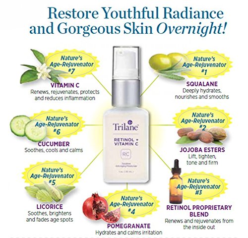 TRILANE RETINOL ANTI-AGING MOISTURIZER GENTLY RESTORES RADIANT SKIN WITH NO IRRITATION with a proprietary blend that includes retinol, retinyl palmitate, and vitamin C esters, plus key botanicals such as pomegranate, aloe, cucumber, and licorice extracts.