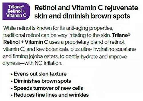Trilane® Retinol + Vitamin C uses a proprietary blend that includes retinol and vitamin C esters, plus key botanicals, such as pomegranate, aloe, cucumber, and licorice extracts, to gently restore radiant skin with NO IRRITATION. The jojoba in esters in Trilane Retinol + Vitamin C can gently lift and firm skin in as little as 5 hours. Plus, in a recent consumer study, real women ages 44-59 reported astonishing results at 7 days and again at 28 days. All results were obtained through self-assessment questionnaires. 100% of the women reported noticeably softer, smoother, and more hydrated skin. 91% said skin looked radiant and brighter. 75% reported reduced appearance of wrinkles and lines. 83% said it diminished the crow's feet around their eyes. And 100% reported visible improvements in skin texture-including less roughness and dryness. As an added bonus, this vitamin C moisturizer gently shrinks dilated pores that seem to get bigger over time, not smaller. In fact, more than half of the women who participated in the study noticed that their pores appeared to be smaller after using the product for just 7 days. With its gentle exfoliating action, cell-renewing power, and soothing botanicals, Trilane Retinol + Vitamin C moisturizer can help your skin be radiant, smooth, and flawless again-regardless of your age. Trilane Retinol + Vitamin C is gentle enough to use as part of your everyday Trilane skincare routine.Feature