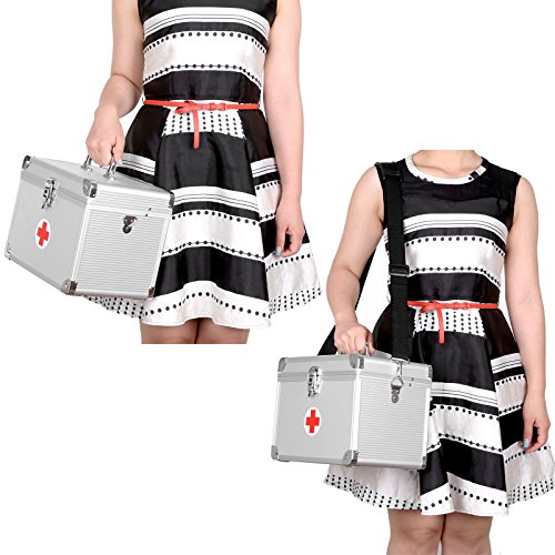 -. Feature : Robust und leicht - Material: silbrige Leiste aus Alulegierung + silbrige gerillte Oberfläche aus ABS + mitteldichte Holzfaserplatte (MDF). Leicht aber dennoch stabil. Verschleißfest, knickfest und langlebig / Praktische Einteilung - Die 1. Ebene ist in 2 Fächer eingeteilt. Darin können Verbandsmaterial, Fieberthermometer, Einweg-Spritzen sowie Augentropfen ordentlich gelagert werden. Auf der 2. Ebene können Medikamente, Reinigungsmittel usw. sicher aufbewahrt werden. In die beiden seitlichen Stecktaschen kann man die Werkzeuge wie Scheren und Bastelmesser legen / Abschließbar mit Schlüssel - Ausgestattet mit 1 Schloss und 2 Schlüsseln kann die Box verschlossen werden, dadurch können Medikamente sicher vor Kindern oder Haustieren gelagert werden, außerdem wird die persönliche Privatsphäre geschützt / Gute Verarbeitung, schickes Design - Die silbrige Aluleiste und gerillte Oberfläche aus ABS verleihen der Box einen modernen Look. Mit Tragegriff aus ABS ist sie leicht zu tragen. Innenraum mit weichem Samt ausgekleidet, was zusätzlichen Schutz für Artikel darinnen bietet / Vielseitig einsetzbar - Ideal für Unternehmen, öffentliche Einrichtungen und den Haushalt. Mit einem verstellbaren Trageriemen ist der Erste Hilfe Kasten im Freien auch möglich. Mit gut zu erkennendem Erste-Hilfe Kreuz