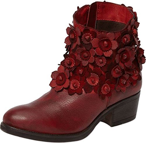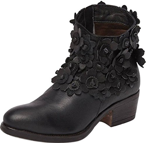 Product Description3D flowers blossom all over an eye-catching leather bootie in a Western, almond-toe silhouette lofted by a stacked heel.0