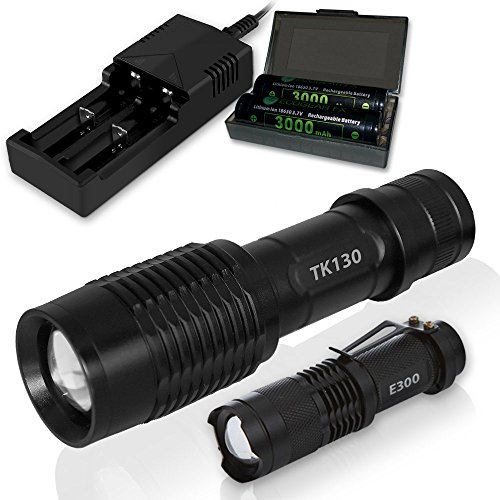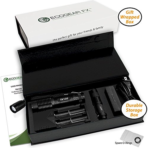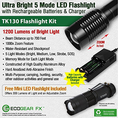 EcoGear FX Camping LED Flashlight Kit (TK130): For Camping, Security, Tactical, & General Use - Offers a Zoom Function and 5 Light Modes - Includes Rechargeable Batteries, Charger & Mini Flashlight