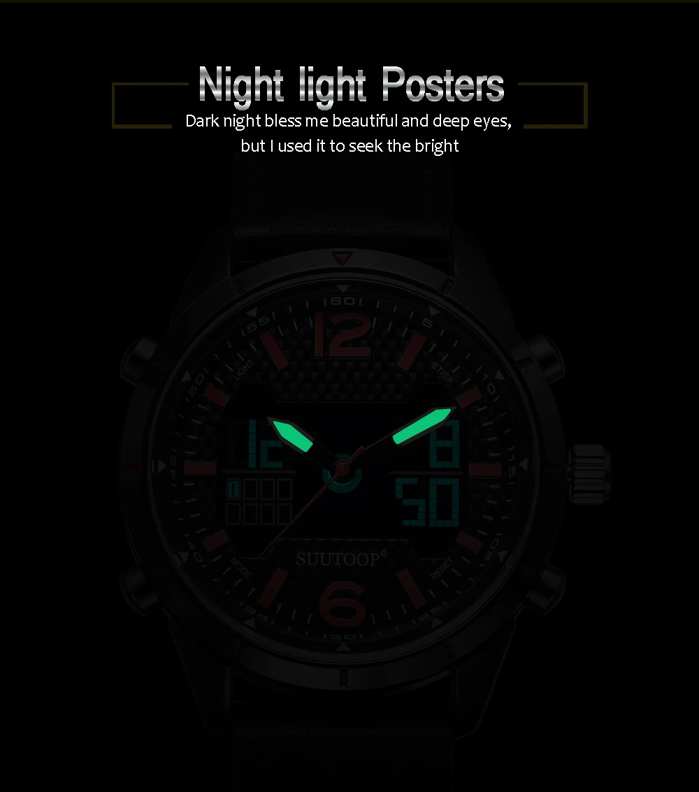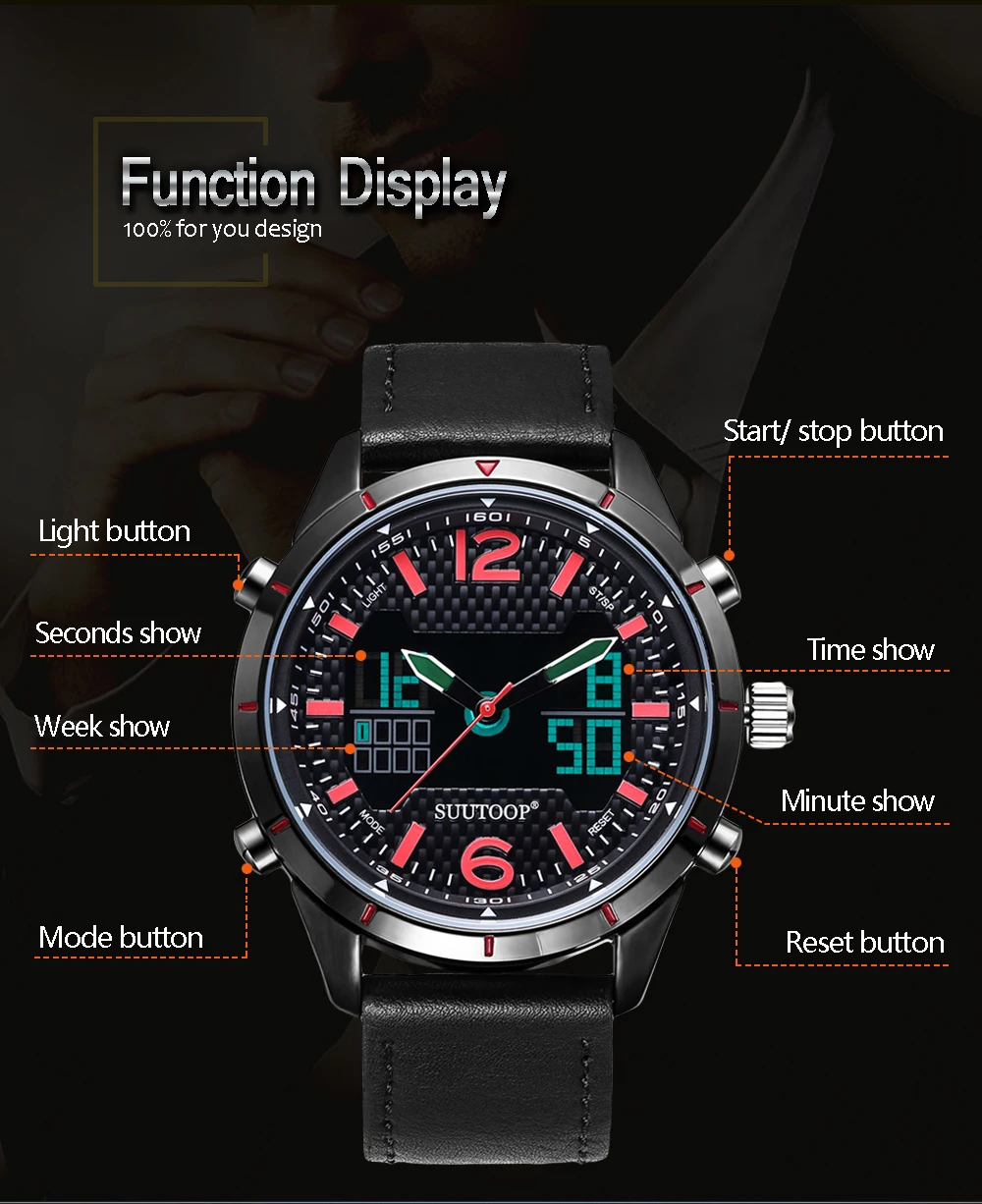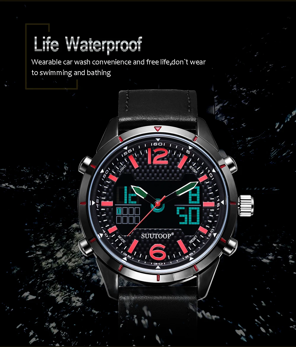 Feature:Complete Calendar,Shock Resistant,Week Display,Water Resistant,Stop Watch,Back Light,LED display,Alarm