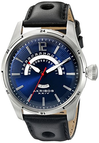 -. Binding : Watch -. Brand : Akribos XXIV -. Color : Black/Blue -. Department : mens -. EAN : 0848572071321 -. Feature : Navy radiant sunburst dial with three hand movement featuring day display window at 6 o'clock and date retrograde / Individually hand applied silver tone Arabic numerals and stick index with luminescent filled black sword style hands / Brushed stainless steel case with black genuine leather strap / Quartz movement with analog display / Water-resistant to 50 M (165 feet) -. Label : TWI Watches, LLC -. Manufacturer : TWI Watches, LLC -. Model : AK850BU -. MPN : AK850BU -. PartNumber : AK850BU -. ProductGroup : Watch -. ProductTypeName : WATCH -. Publisher : TWI Watches, LLC -. Studio : TWI Watches, LLC -. Title : Akribos XXIV Men's AK850BU Round Navy Dial Three Hand Quartz Stainless Steel Strap Watch -. UPC : 848572071321