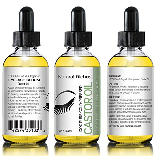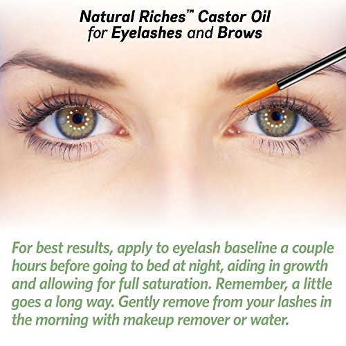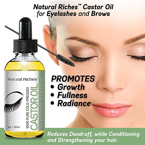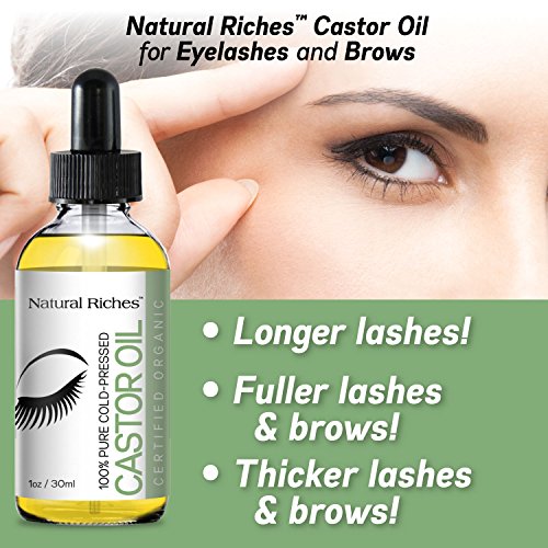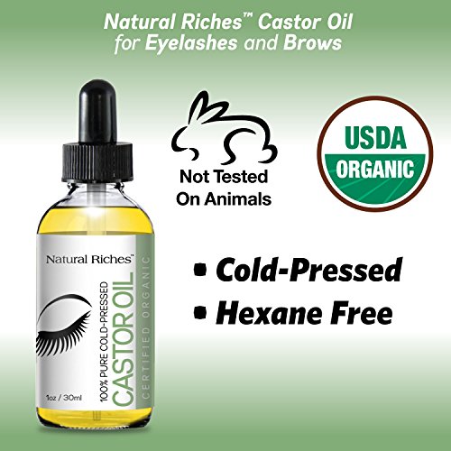 [Product Information]- NATURAL RICHES CASTOR OIL, Premium Quality, 100% Pure, Cold pressed, USDA certified Castor Oil, Hexane free. Boosts the length and thickness of eyelashes and eyebrows. Helps promote the long-term vitality and strength of your eyelashes and eyebrows by helping to prevent thinning and breakage.