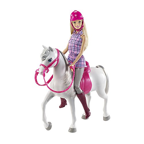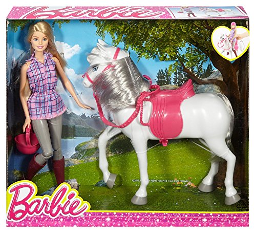 Barbie doll and her beautiful horse are ready to ride! Tell adventurous tales on horseback or play out grooming moments between the two best friends. Barbie doll's horse has a soft mane and tail for realistic touches and comes with a removable pink saddle, bridle and reins. Barbie doll wears a casual riding outfit, including plaid tunic, tall riding boots and helmet -- pink, of course, to match her horse. Place Barbie doll in the saddle for horseback riding fun! Includes Barbie doll wearing fashion and accessories, plus horse with removable riding gear. Doll cannot stand alone. Colors and decorations may vary.Feature