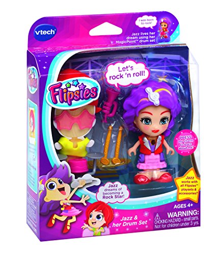-. Binding : Toy -. Brand : VTech Flipsies -. EAN : 3417761725009 -. Feature : Jazz is a 2-in-1 doll that magically transforms into a rock star through cute outfits, wigs and accessories that can be shared with all Flipsies (additional Flipsies sold separately) / Press the charm on Jazz's doll necklace to see it light-up and hear her talk about her dream and the things she likes to do / Place Jazz on the MagicPoint next to her drum set or other MagicPoint locations on Flipsies dollhouse playsets (each sold separately) and she'll respond with playful phrases unique to her own personality / 1 MagicPoint location triggers fun phrases; 8 fun doll accessories include wigs, clothes, drum sticks and more / Doll interacts with all Flipsies doll playsets (each sold separately); let your dreams shine with Flipsies / Requires 3 LR44 batteries (batteries included for demo purposes only; new batteries recommended for regular use); intended for ages 4 to 9 years -. Genre : family -. IsAdultProduct : 0 -. Label : VTech -. Manufacturer : VTech -. Model : 80-172500 -. MPN : 80-172500 -. PackageQuantity : 1 -. PartNumber : 80-172500 -. ProductGroup : Toy -. ProductTypeName : TOYS_AND_GAMES -. Publisher : VTech -. Studio : VTech -. Title : VTech Flipsies Jazz and her Drum Set -. Warranty : 90 day warranty against manufacturer defects