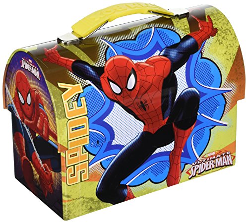 Carry all large Marvel spider man workman's assorted- Officially licensed metal Marvel spider man tin box with a rounded hinged top, metal latch, and collapsible plastic handle
