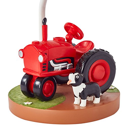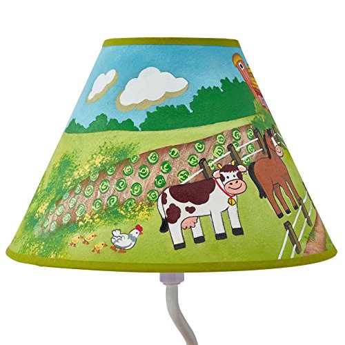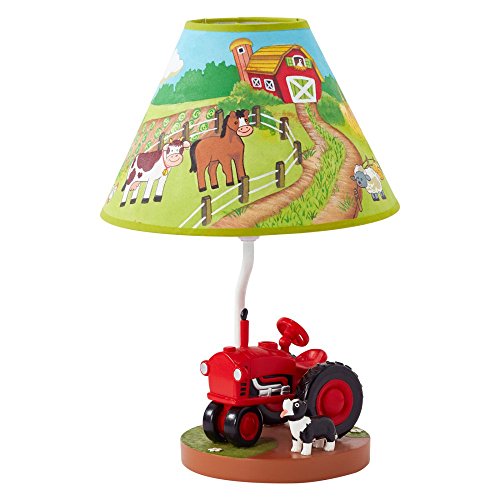 Light up your child's life with a clear path to the farm! The Happy Farm Lamp lights the way to adventures down on the farm that are sure to delight. Base of lamp features a bright red tractor with a sheep dog in tow, and shade features a cow and a horse grazing about the pastures near their barn. This hand painted beauty is sure to leave a lasting impression on children as they fall asleep to its soft glow, or wake up to start a brand new day before the rooster crow. Light bulb is not included.Feature