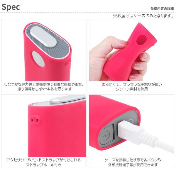 | 柔らかくてサラサラな手触りの、加熱式タバコglo(TM)(グロー)専用のシリコンケースです。しなやかな弾力性と耐衝撃性で軽度な振動や衝撃、擦り傷等からglo(TM)本体を守ります。また、グリップ力が強く手に馴染みやすいデザインです。ストラップホール付きで、ケースを装着した状態で各ボタンや外部接続端子等が使用できます。 |