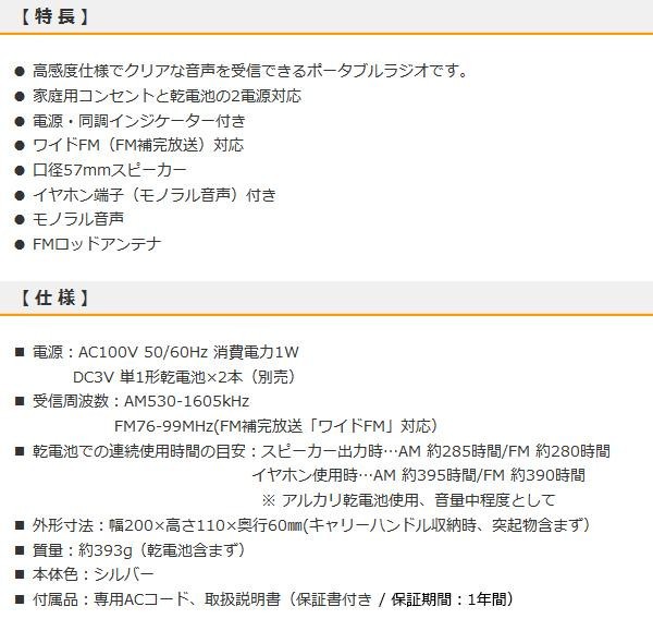 ワイドFM(FM補完放送)対応のポータブルラジオです。口径57mmスピーカーでクリアな音声でラジオをお楽しみいただけます。