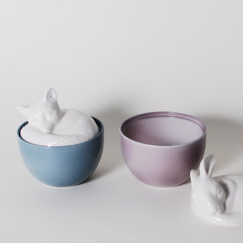 - Made from a glazed porcelain with a white animal top and colored container base