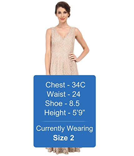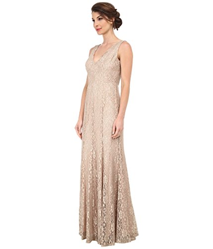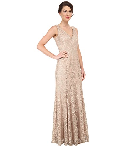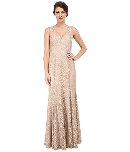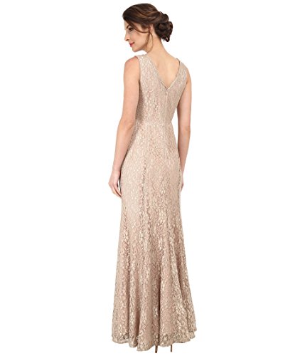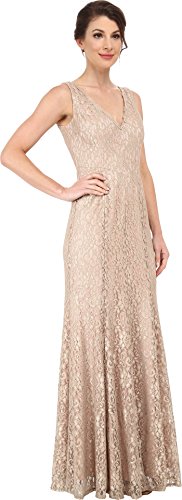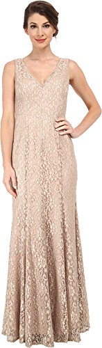 Binding : Apparel Product Description Lace trim decorates the V-neckline and back. Concealed zip-closure in back. Flared, mermaid hem. Neutral lining throughout. Lace: 86% nylon, 12% polyester, 2% spandex; Combo: 95% polyester, 5% spandex; Lining: 100% polyester. Dry clean only. Imported. 0