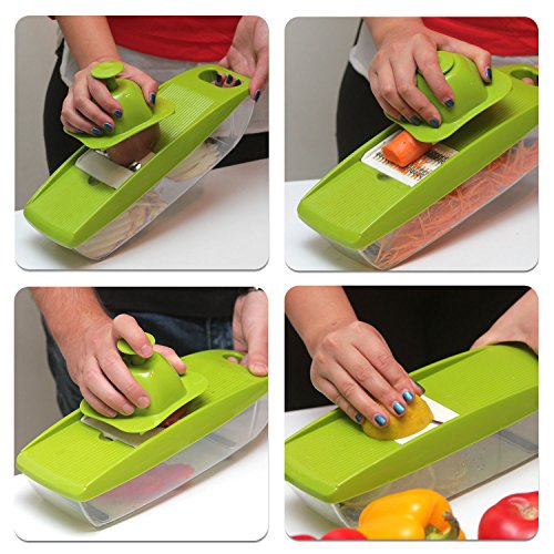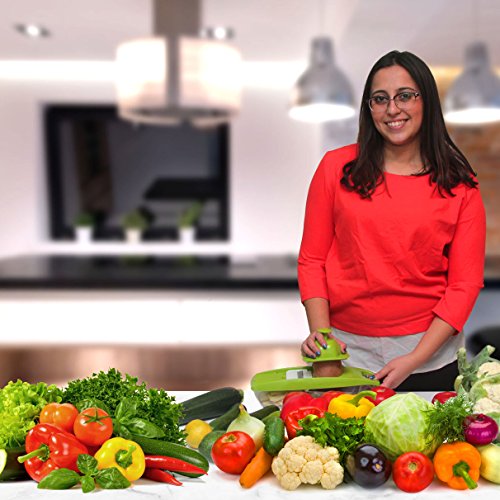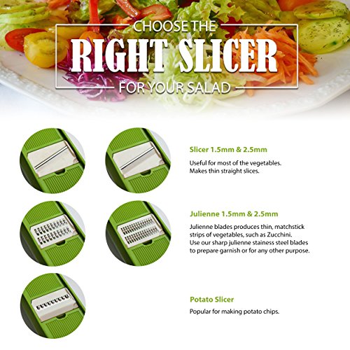 - ✪ THE ONLY VEGETABLES SLICER YOU’LL NEED. Whether you need something sliced, chopped, or grinded, our Mandoline Cutter is your one-and-only tool. Accommodating 5 easily interchangeable stainless steel razor sharp blades, it can slice cabbage & carrots for your coleslaw, cut tomatoes and onions for your burgers, or even cheese and chocolate. We’ve threw in a FREE BONUS peeler (valued at $5.97), to make sure you’ll have everything in your kitchen to work immediately!