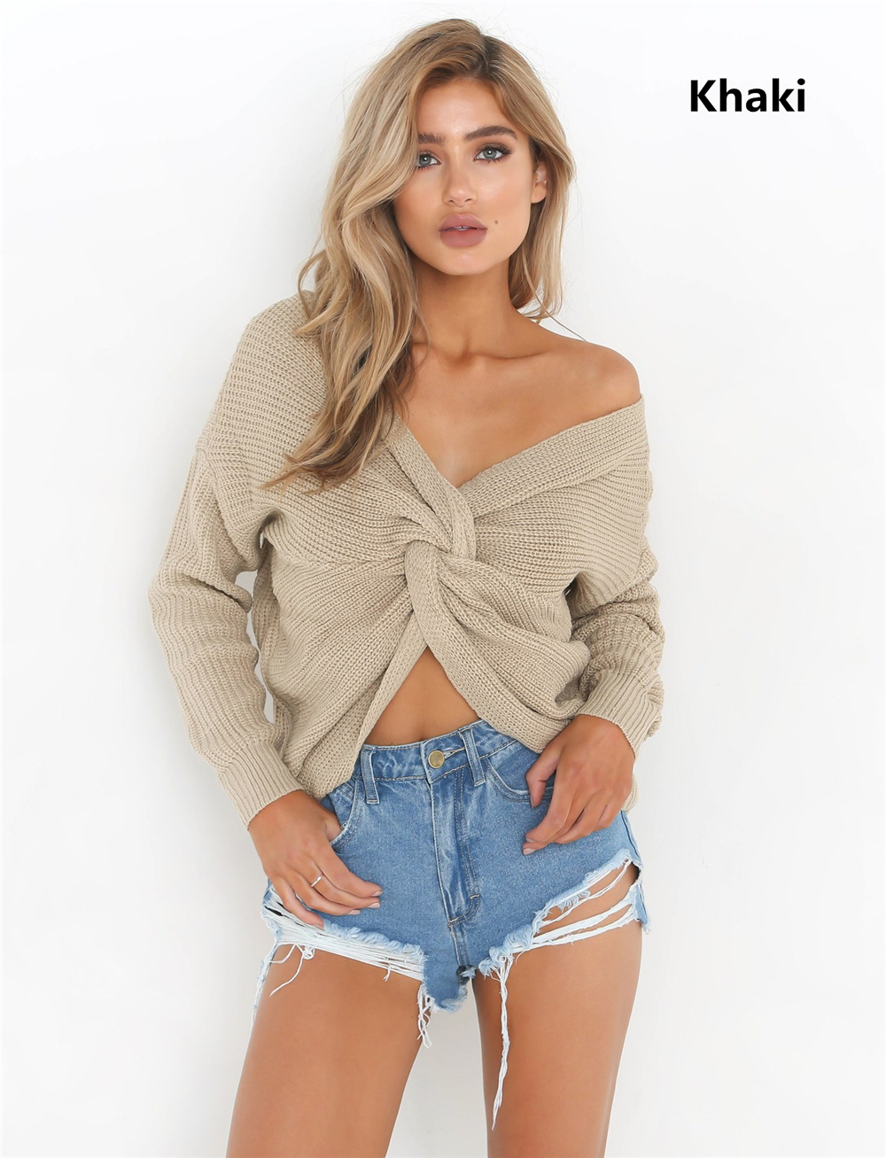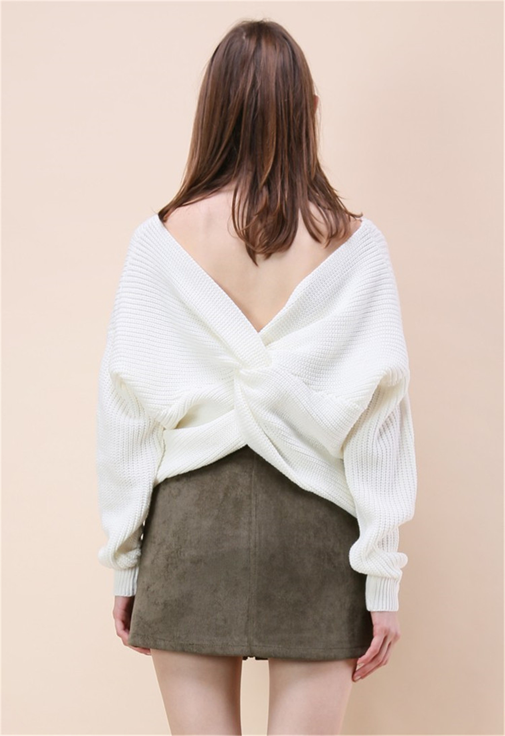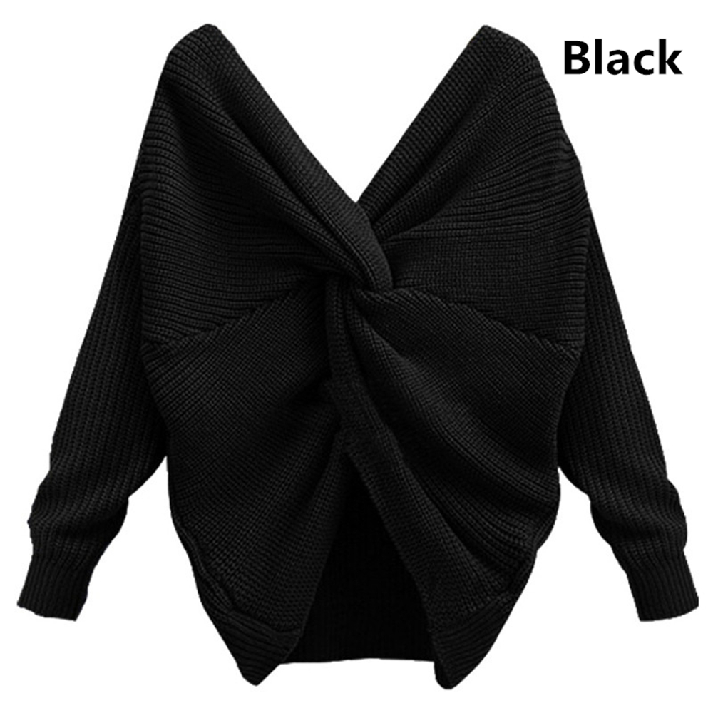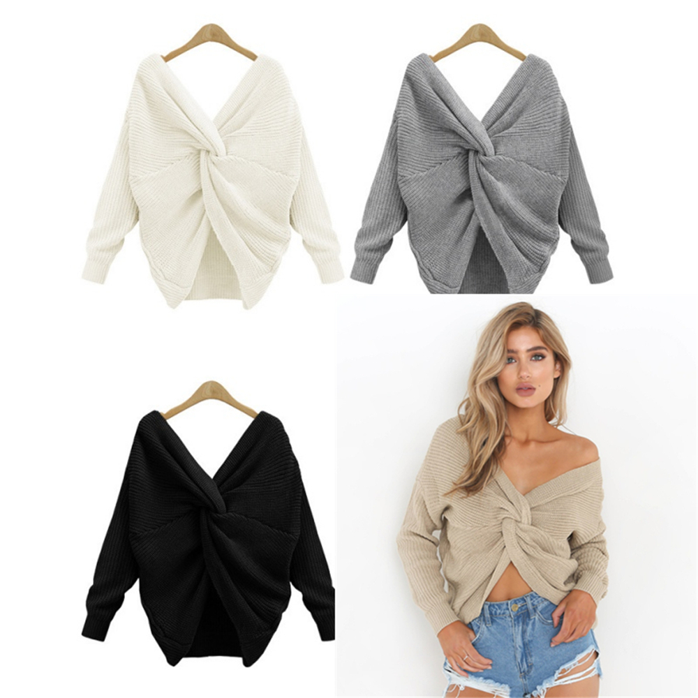 V Neck Twisted Back Sweater Long Sleeve Knitted Women Jumpers Pullovers 4 Colors