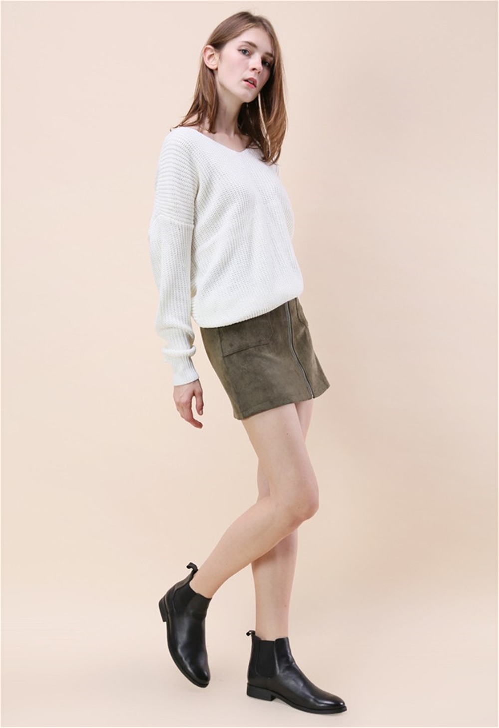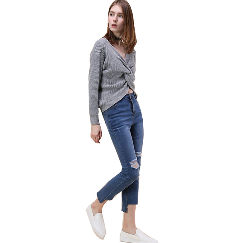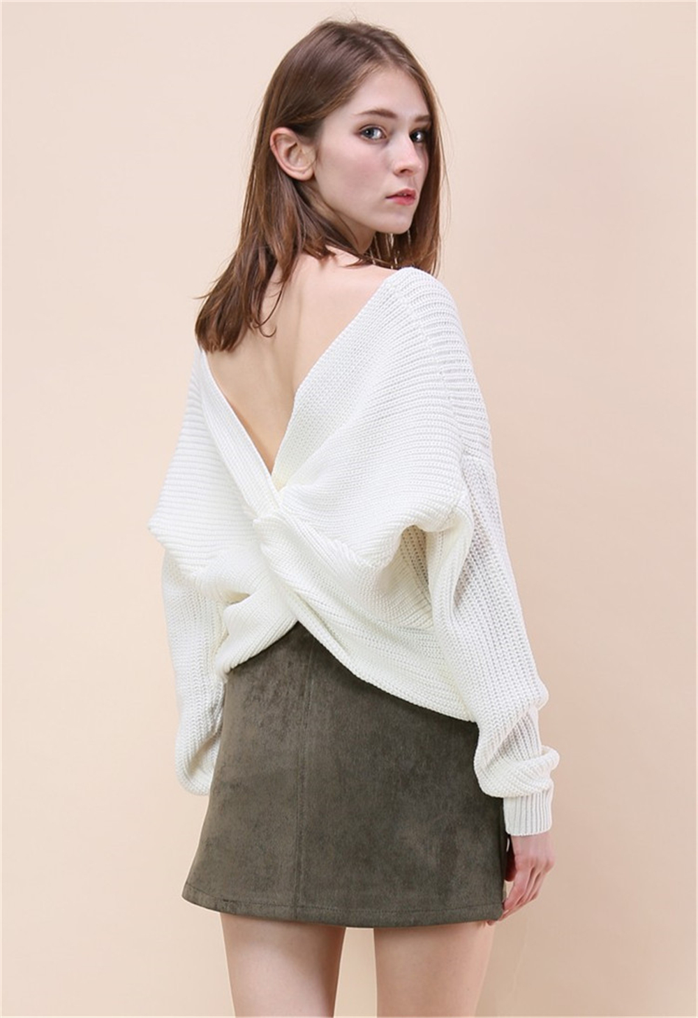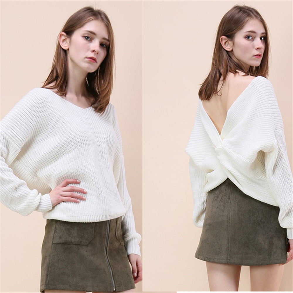 V Neck Twisted Back Sweater Long Sleeve Knitted Women Jumpers Pullovers 4 Colors