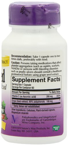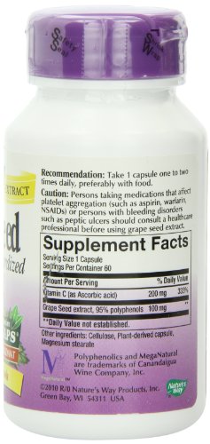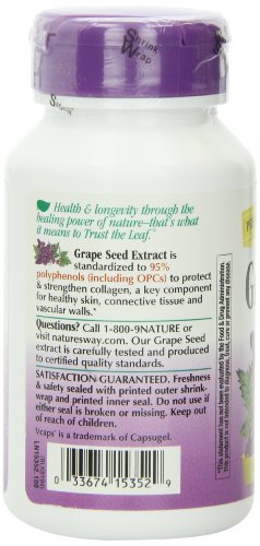 -. Binding : Health and Beauty -. Brand : Nature's Way -. Department : Health and Beauty>Health and Wellness -. EAN : 6935743184431 -. Feature : Nature's Way -. IsAdultProduct : 0 -. IsAutographed : 0 -. IsMemorabilia : 0 -. Label : Nature's Way -. LegalDisclaimer : * These statements have not been evaluated by the Food and Drug Administration. This product is not intended to diagnose, treat, cure or prevent any disease. ** Always refer to the manufacturer's label on the product for description, recommended dose and precautions. -. Manufacturer : Nature's Way -. Model : 15352 -. MPN : 15352 -. NumberOfItems : 1 -. PackageQuantity : 1 -. PartNumber : 15352 -. ProductGroup : Health and Beauty -. ProductTypeName : HEALTH_PERSONAL_CARE -. Publisher : Nature's Way -. ReleaseDate : 2010-05-13 -. Size : 60 -. Studio : Nature's Way -. Title : Nature's Way Grape Seed, 60 Vcaps -. UPC : 885259956724