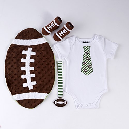Feature : Includes one bodysuit with football tie imprint, lap shoulders, and bottom snaps, one pair of socks, one soft and cozy cuddler and one pacy clip / Fits size 0-6 months / Plastic pacy clip is hand wash/spot clean