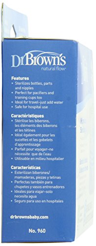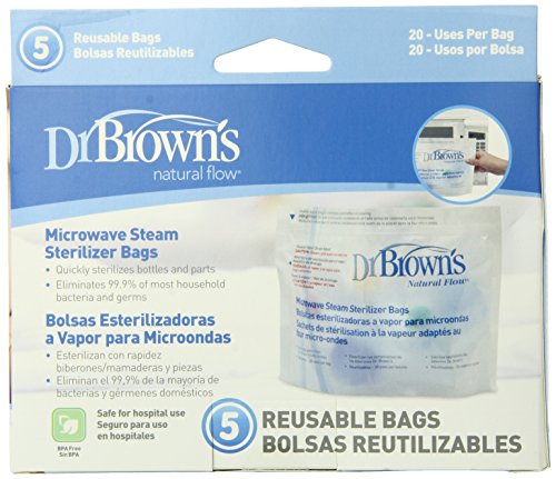 The Dr. Brown's Natural Flow Microwave Steam Sterilizer Bags sterilizes parts from Dr. Brown's baby bottles, eliminating 99.9% of most household bacteria and germs. They are designed to fit all Dr. Brown's baby bottle parts, and they are perfect for steam cleaning while on‐the‐go or while traveling. Five sterilizer bags come to a pack, and each bag is reusable – up to 20 times. This offers moms 100 uses per retail pack.