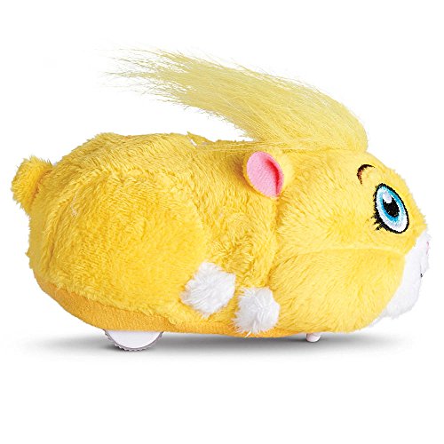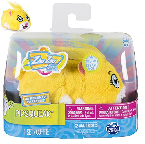 Zhu Zhu Pets Hamster Pipsqueak is the ringleader of the Zhu crew! Bring this 4-inch long critter home for hours of zany fun! Covered in bright yellow fur, this happy Hamster is always ready to race into adventure. Press the button on her lower back and she'll take off running and spinning. The sensor in her nose helps Pipsqueak navigate any space. Make sure you keep up! Push down on the back of her neck to hear her make sweet hamster noises! It's easy to tell why this Hamster is so special; even her birthmark is a shooting star! Pipsqueak's bubbling energy and sparkling personality make her beloved by the Zhu Zhus.Feature
