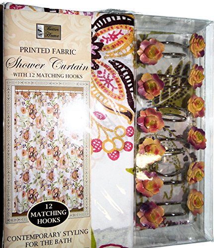 - Includes: Fabric Shower Curtain, 12 matching resin shower hooks