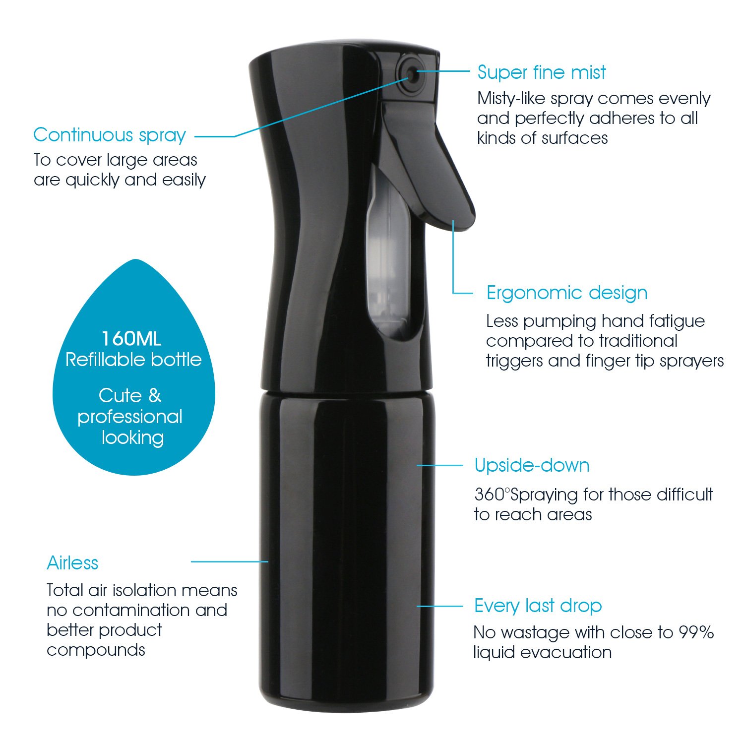 連続スプレー - 数秒間持続する持続的なミストの流れを生成し、広い領域を迅速かつ容易にカバーすることができます。 さらに、人間工学に基づいたデザインは、従来のトリガと指先の噴霧器に比べて手の疲れを軽減します。