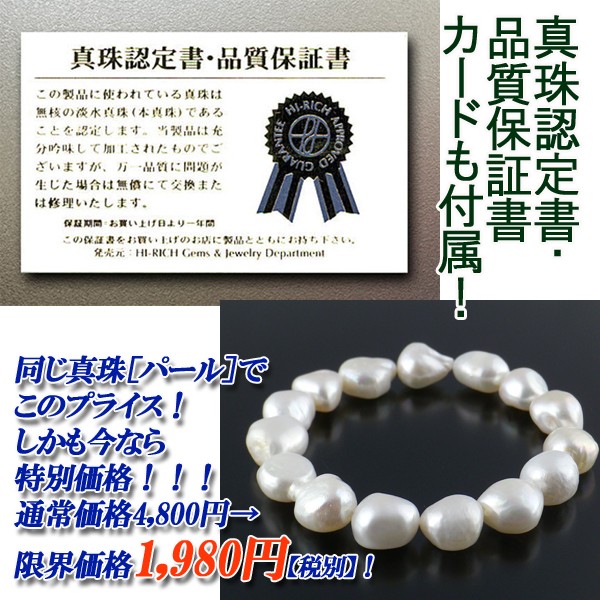 入手困難!丸くない真珠「バロックパール」ならこの価格・・・2,138円!!!二つと同じ形が存在しない『バロックパール』の魅力!世界中を虜にする奇跡の賜”真珠[パール]”の番外的・偶然的形状!【バロックパール】が今、カジュアルシーン、ファッション・アクセントとして大ブレイク!!●真珠認定書・品質保証書カードも付属!高級な光沢艶とセレブなオーラを発する【バロックパール】!限定数に達し次第販売終了になる場合がございます。同じ真珠[パール]でこのプライス!しかも今なら特別価格!!!通常価格5,184円→特別価格2,138円!■サイズ:(フリー)伸縮式16~20cm