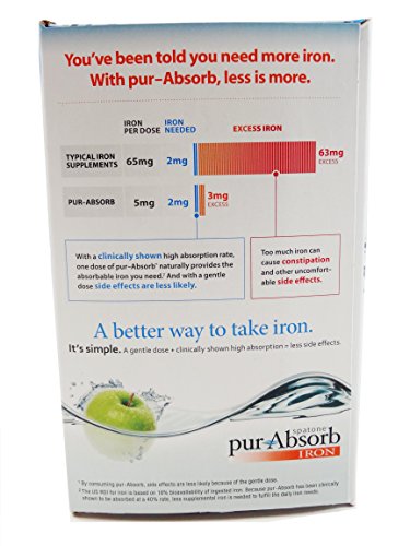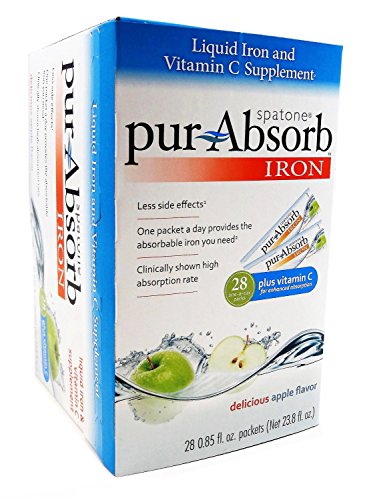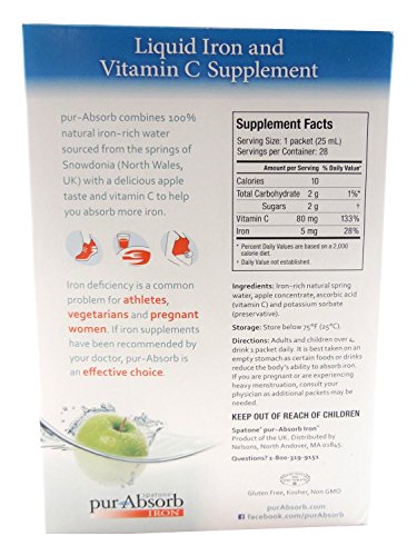 -. Binding : Health and Beauty -. Brand : pur-Absorb -. EAN : 0741273050964 -. Feature : Liquid Iron & Pure Vitamin C Supplement for Enhanced Absorption / One Packet a Day Provides the Absorbable Iron You Need. The US RDI for iron is based on 18% bioavailability of ingested iron. Because pur-Absorb has been clinically shown to be absorbed at a 40% rate, less supplemental iron is needed to fulfill the daily iron needs. / Less Side Effects. By consuming pur-Absorb, side effects are less likely because of the gentle dose. / Ingredients: Iron-rich natural spring water, apple concentrate, asorbic acid (Vitamin C), and potassium sorbate (preservative). (Gluten Free, Kosher, Non-GMO. / Clinically Shown High Absorption Rate. -. IsAdultProduct : 0 -. Label : Nelson's -. Manufacturer : Nelson's -. MPN : 162471-7 -. PackageQuantity : 28 -. PartNumber : 162471-7 -. ProductGroup : Health and Beauty -. ProductTypeName : HEALTH_PERSONAL_CARE -. Publisher : Nelson's -. Studio : Nelson's -. Title : Pur Absorb (Spatone) Liquid Iron & Vitamin C Supplement - 28 Pack (0.85 fl.oz packets) -. UPC : 741273050964